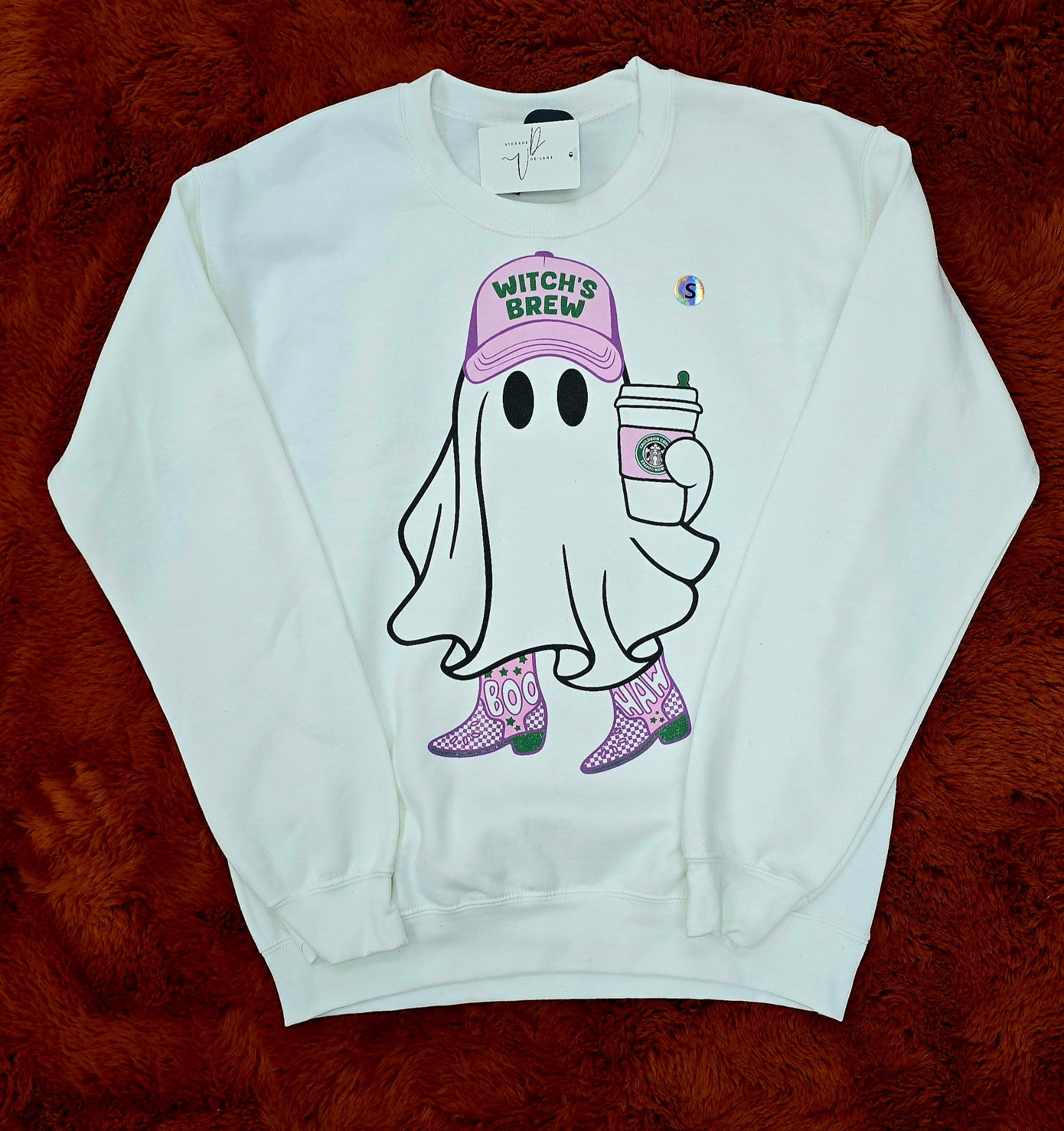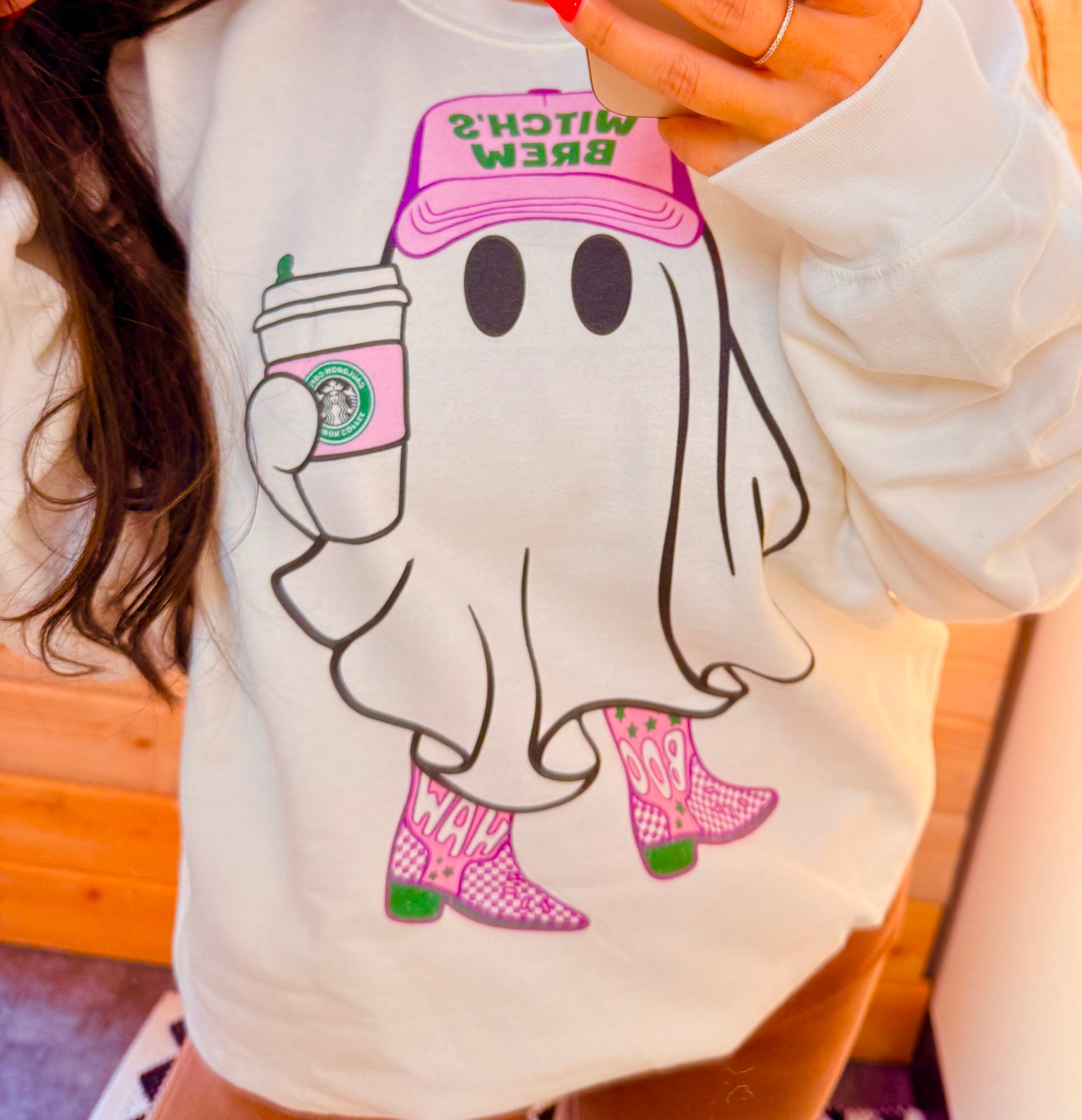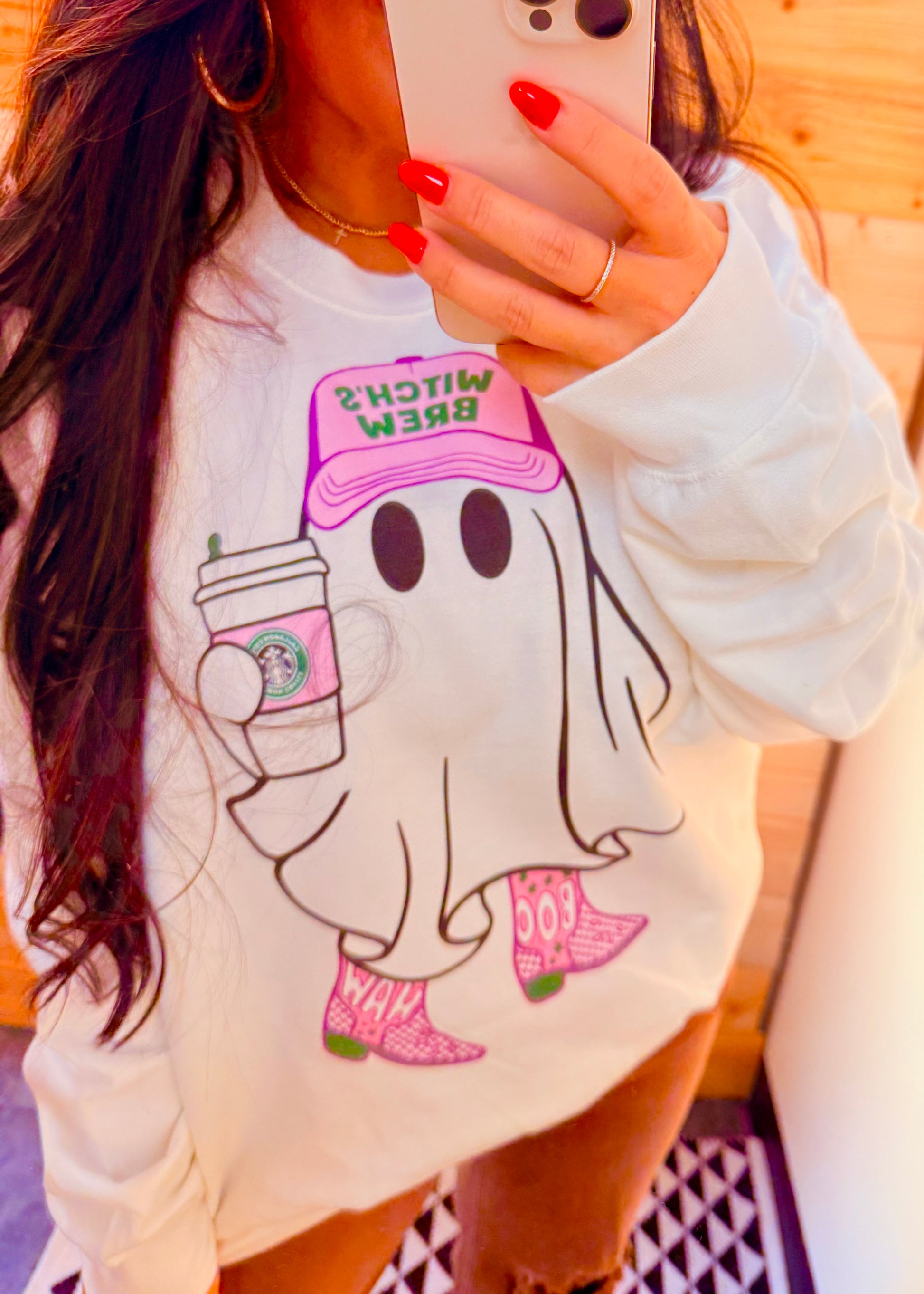 Cozy up in spooky-cute style with this playful ghost sweatshirt! Featuring a latte-loving ghost rocking a Boo Brew cap and purple cowgirl boots, it’s the perfect mix of Western charm and Halloween vibes. Soft, comfy, and festive, this crewneck is a must-have for sipping pumpkin spice and showing off your boo-tiful personality all season long. 👻✨