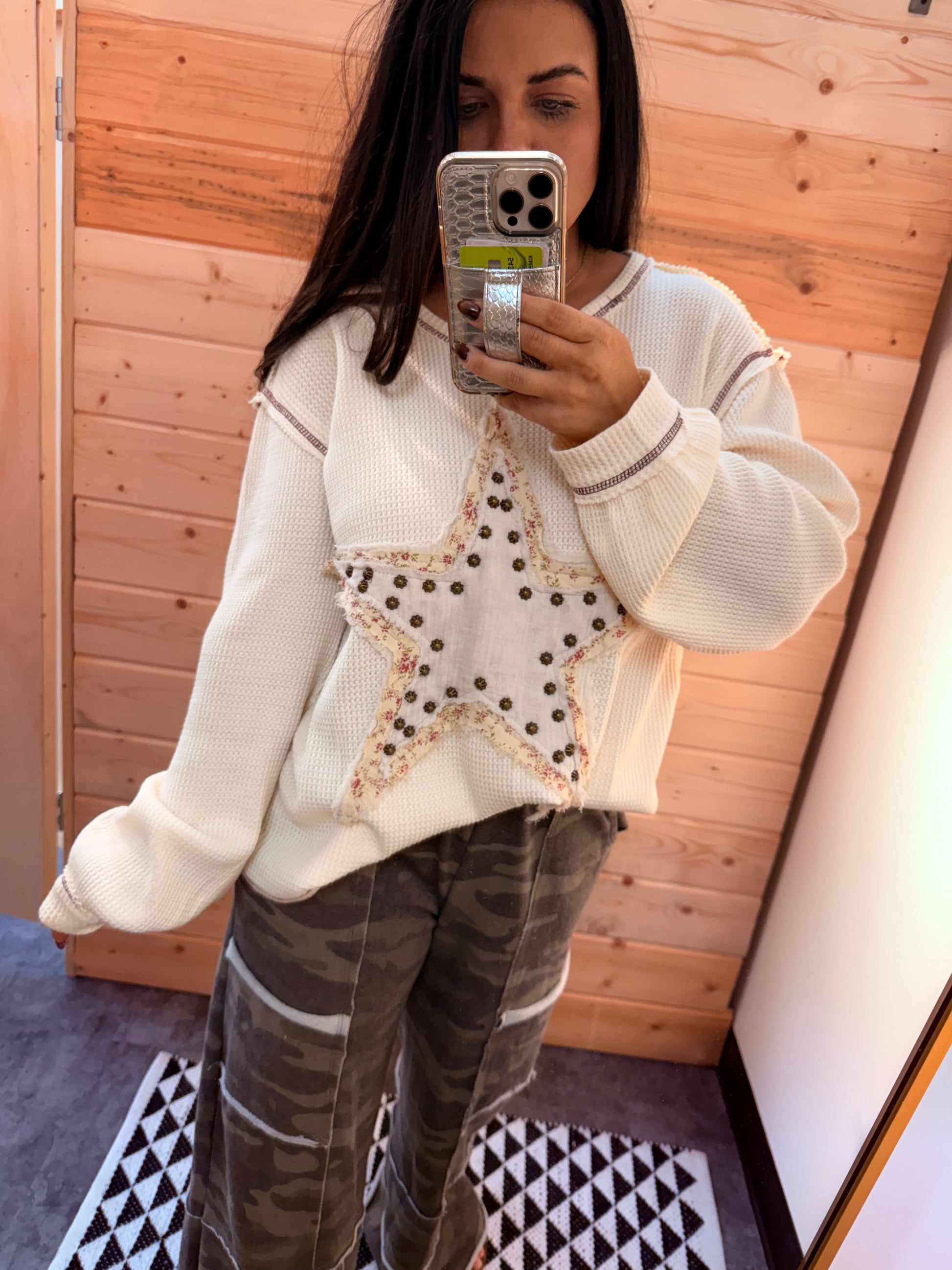 These wide-leg camo pants bring rugged meets glam energy! Featuring patchwork-style seams and a flowy silhouette, they give that easygoing, on-trend vibe that’s perfect for fall markets, concerts, or weekend adventures. Pair them with a cozy graphic or star sweater for a bold boho moment.