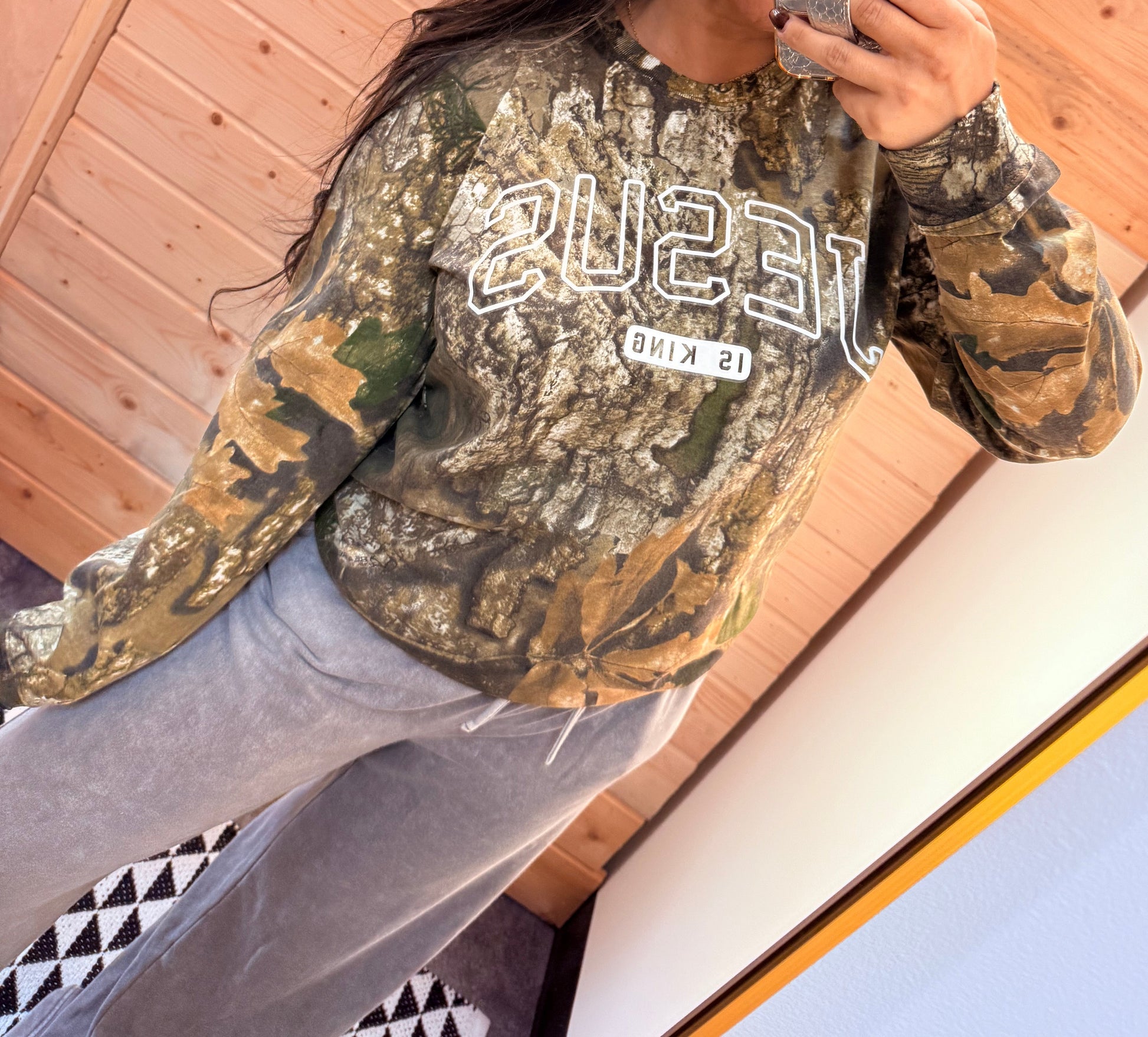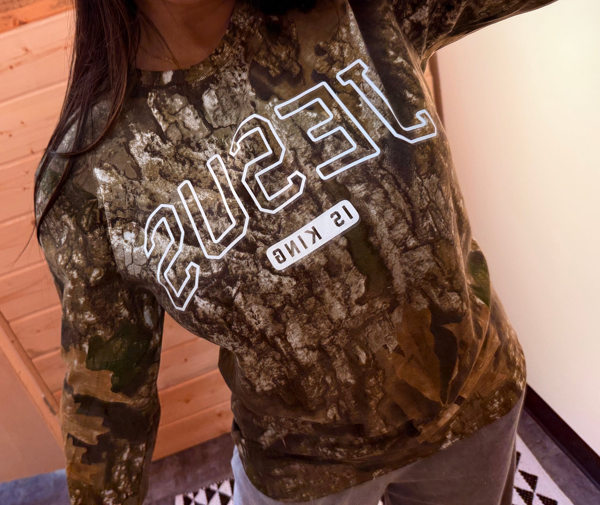 Faith meets fashion in our REALTREE Jesus Is King Camo Crewneck. This cozy long sleeve shirt that features a rustic camo print with bold white lettering that makes a statement of style and belief. Soft on the inside with a relaxed, unisex fit—perfect for layering or wearing solo with jeans or lounge pants.