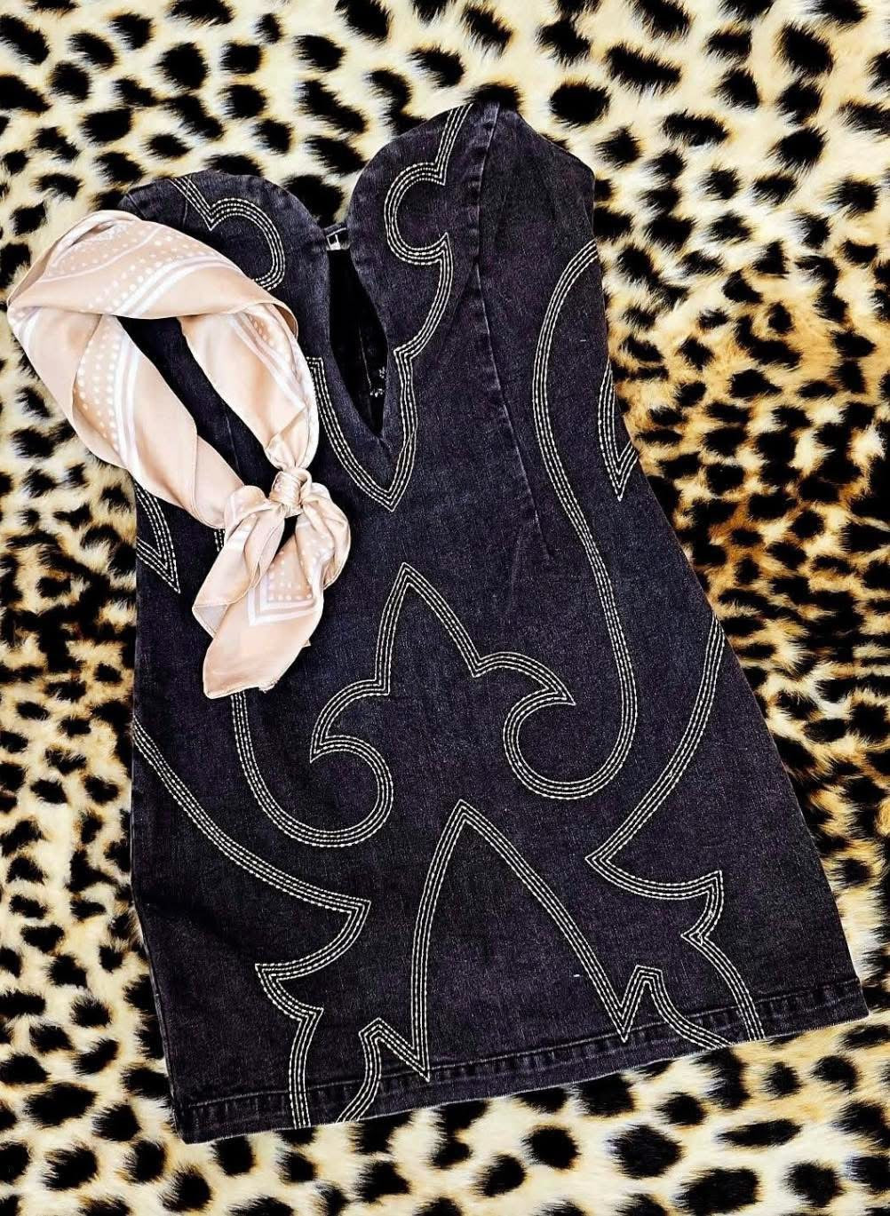 Command attention with this striking strapless mini dress featuring a structured corset-style bodice and bold Western-inspired embroidery. Made from soft black denim, this fitted silhouette highlights your curves with a sculpted sweetheart neckline and front keyhole cutout. Cream contrast stitching forms a statement-making motif down the front and sides, reminiscent of vintage cowboy boot designs. Pair it with turquoise jewelry, a wide-brim hat, or boots for a show-stopping Western Boho look.