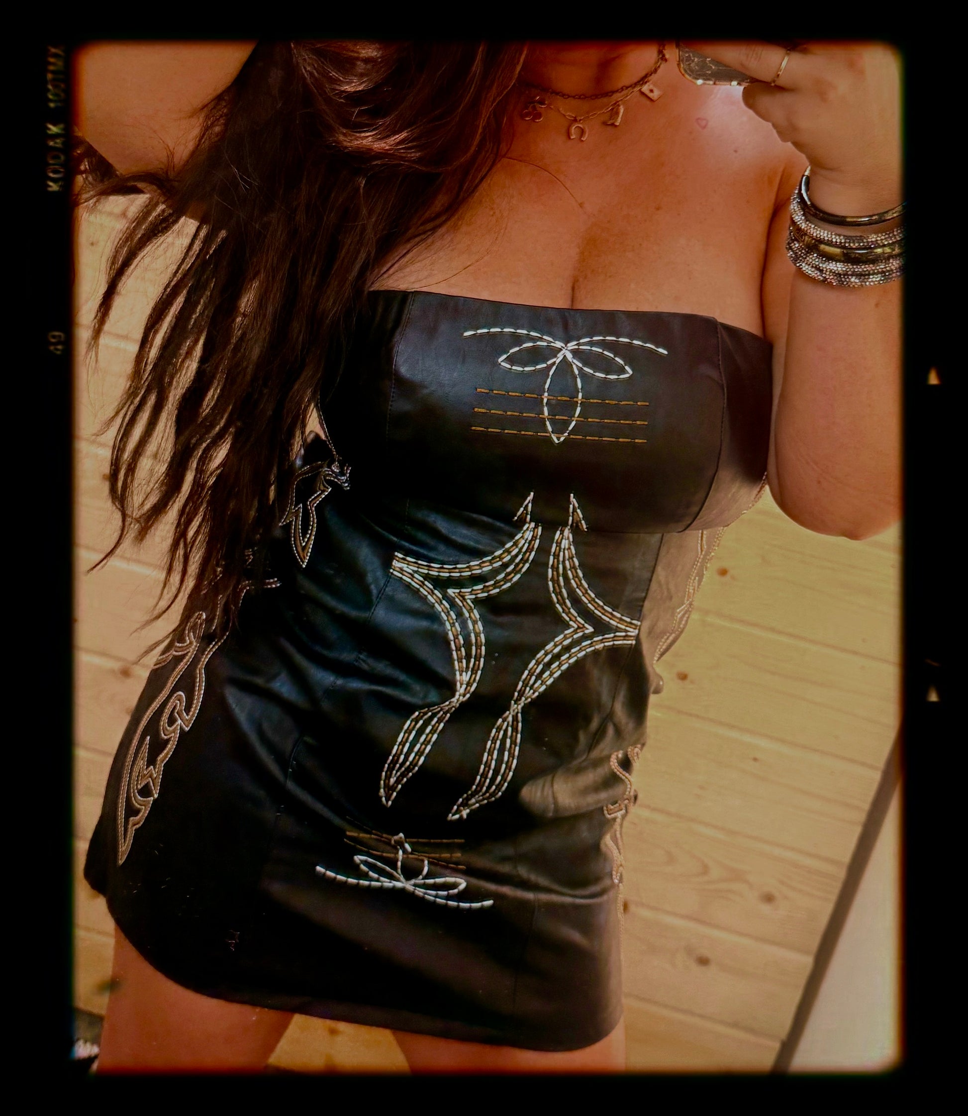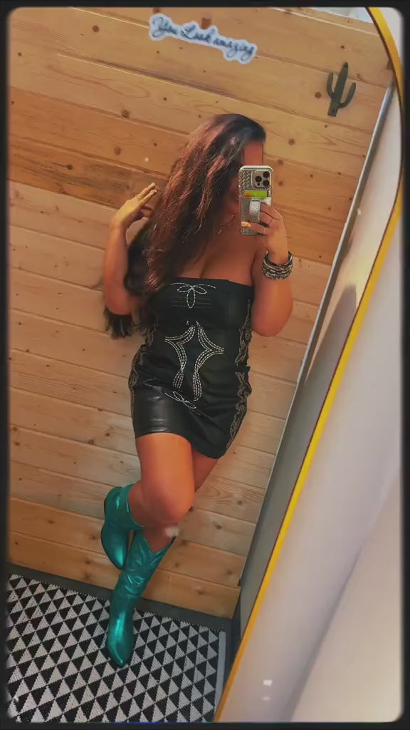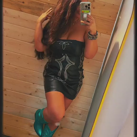 This figure-hugging silhouette features intricate western-inspired embroidery across the front bodice, adding a luxe handcrafted feel to its edgy, modern look. The soft faux leather material is rich in color and texture, perfect for cooler temperatures and seasonal styling. A standout feature is the fully adjustable lace-up back closure, offering both fit flexibility and a striking visual detail. The clean hemline, sculpted seams, and structured form create a flattering shape that enhances the waist while allowing freedom of movement. Whether layered under a statement coat or styled solo with cowboy boots and a hat, this dress makes a powerful addition to any Fall Western collection.