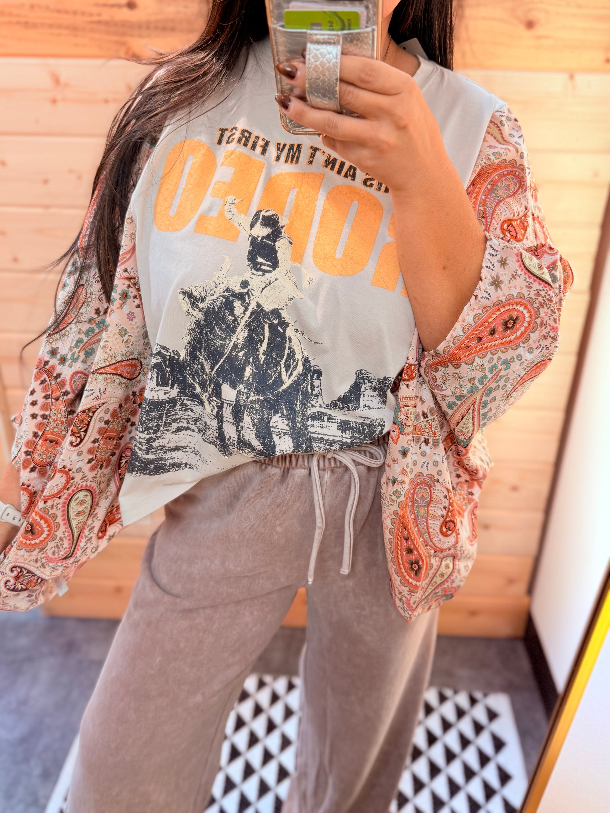 Saddle up, bestie — this ain’t your first rodeo! 🐎 This vintage-washed graphic tee brings all the cowgirl energy with bold golden lettering and a classic rodeo print. It’s soft, relaxed, and effortlessly cool — perfect for layering under a kimono or pairing with your favorite lounge pants for that casual Western edge.